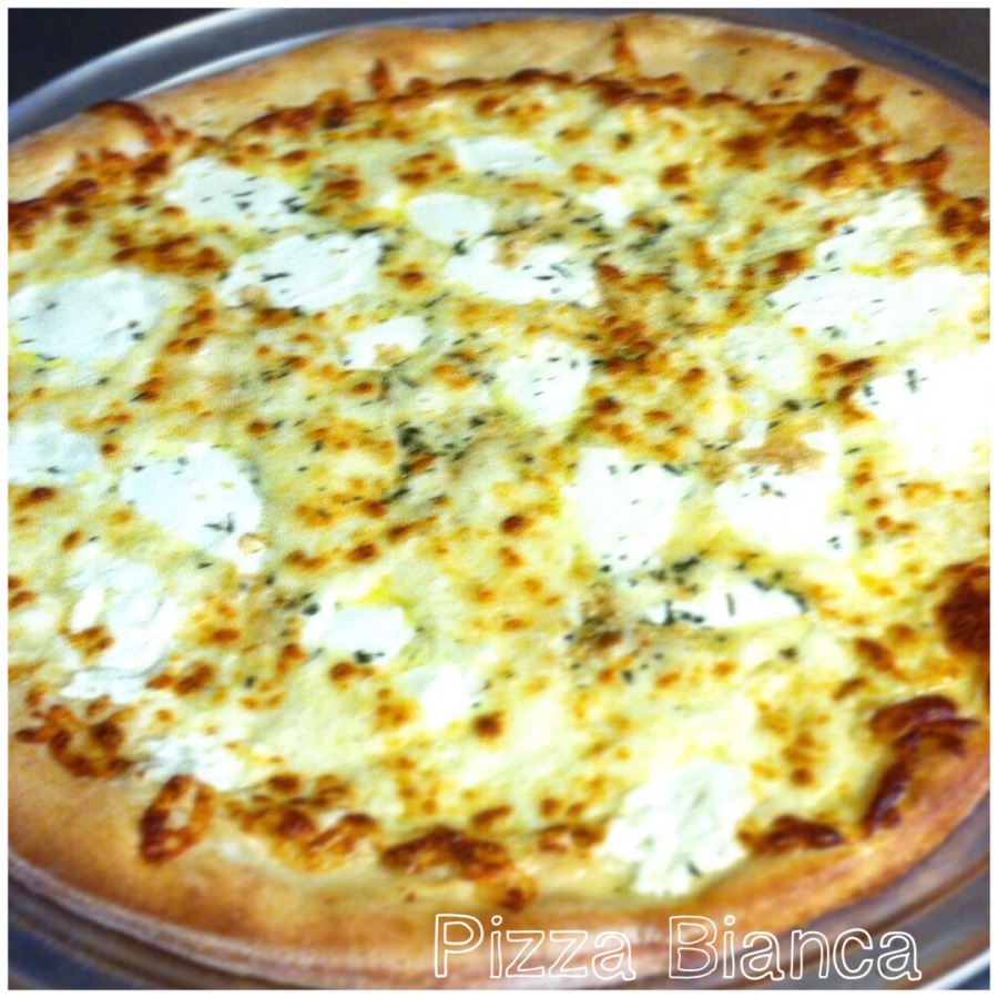 Handmade pizza dough topped with mozzarella cheese, fresh garlic, pecorino cheese, and ricotta cheese